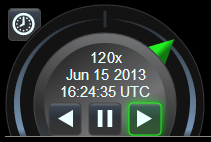 The "shuttle ring" concept is borrowed from video editing, where typically a "jog wheel" can be rotated to move past individual animation frames very slowly, and a surrounding shuttle ring can be twisted to control direction and speed of fast playback. Cesium typically treats time as continuous (not broken into pre-defined animation frames), so this widget offers no jog wheel. Instead, the shuttle ring is capable of both fast and very slow playback. Click and drag the shuttle ring pointer itself (shown above in green), or click in the rest of the ring area to nudge the pointer to the next preset speed in that direction.